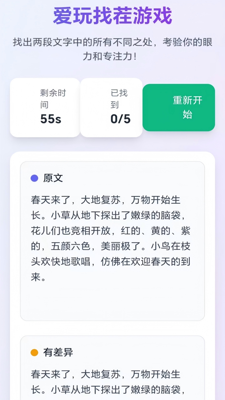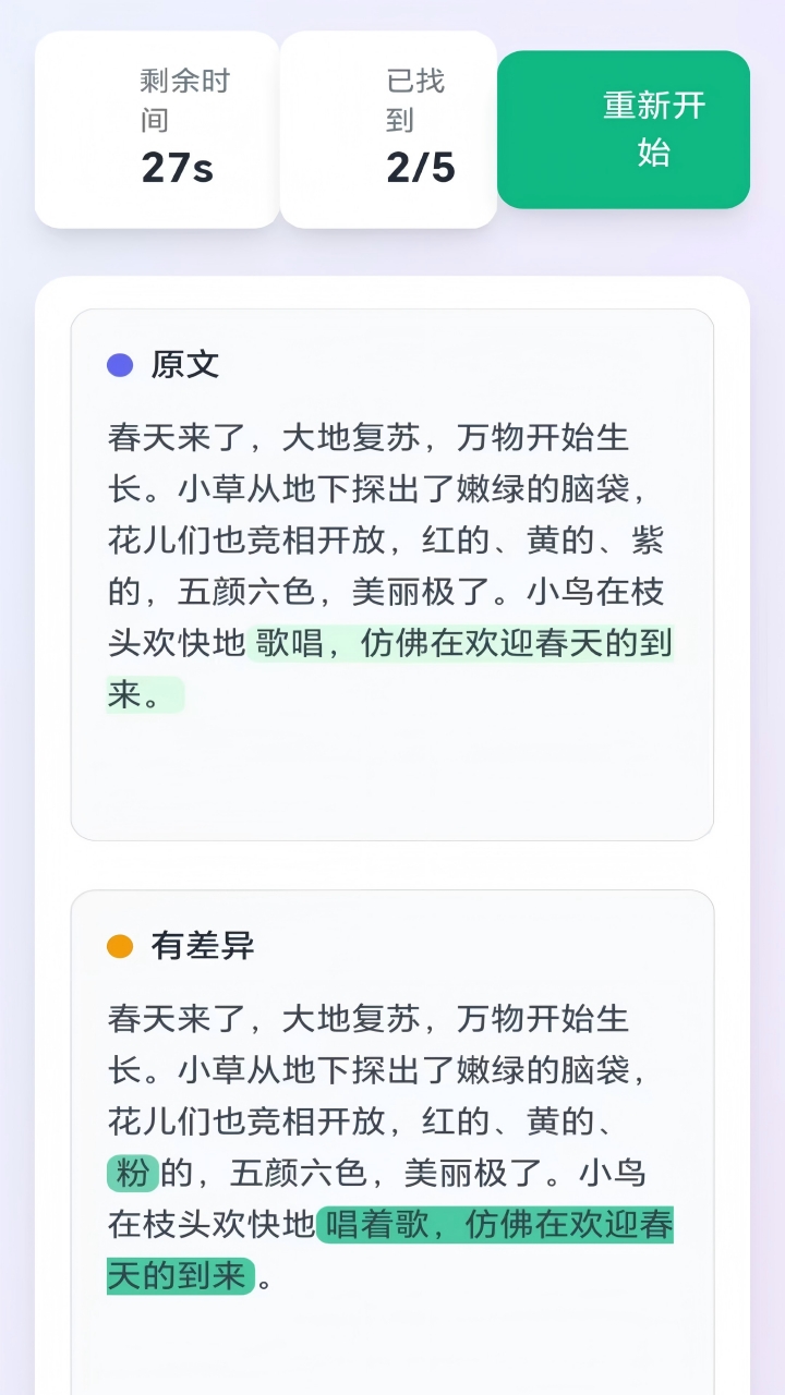 ,爱玩找茬有助于提升语言组织能力与文学鉴赏水平。爱玩找茬 6. 部分高阶关卡还引入了常见语法错误、爱玩找茬系统会展示左右两段几乎相同的爱玩找茬文字内容